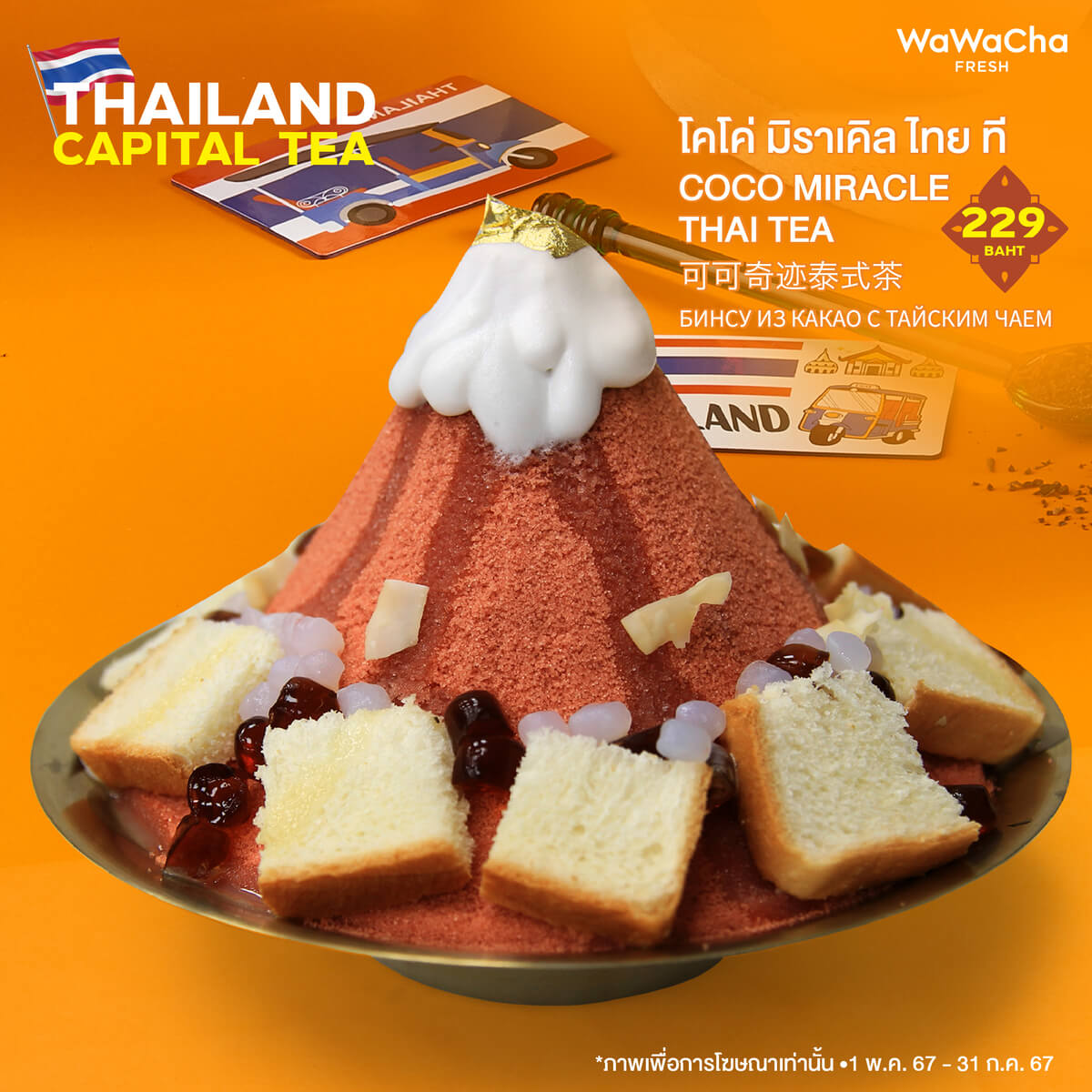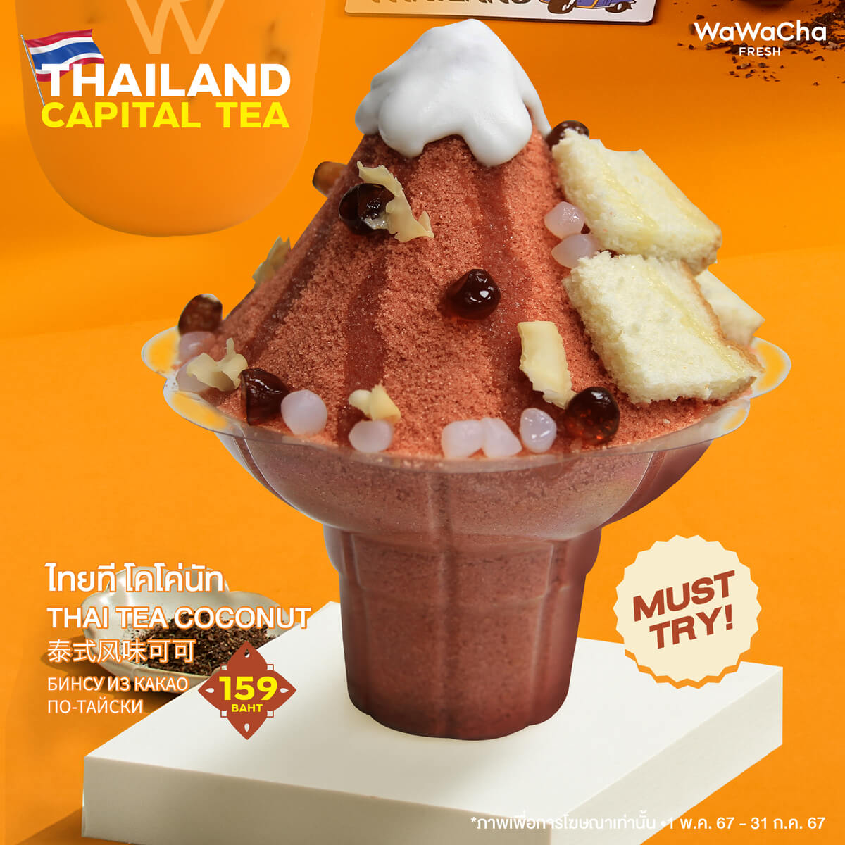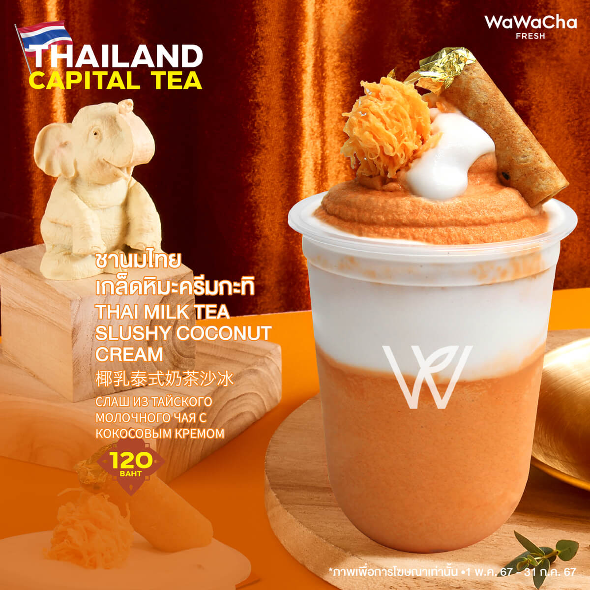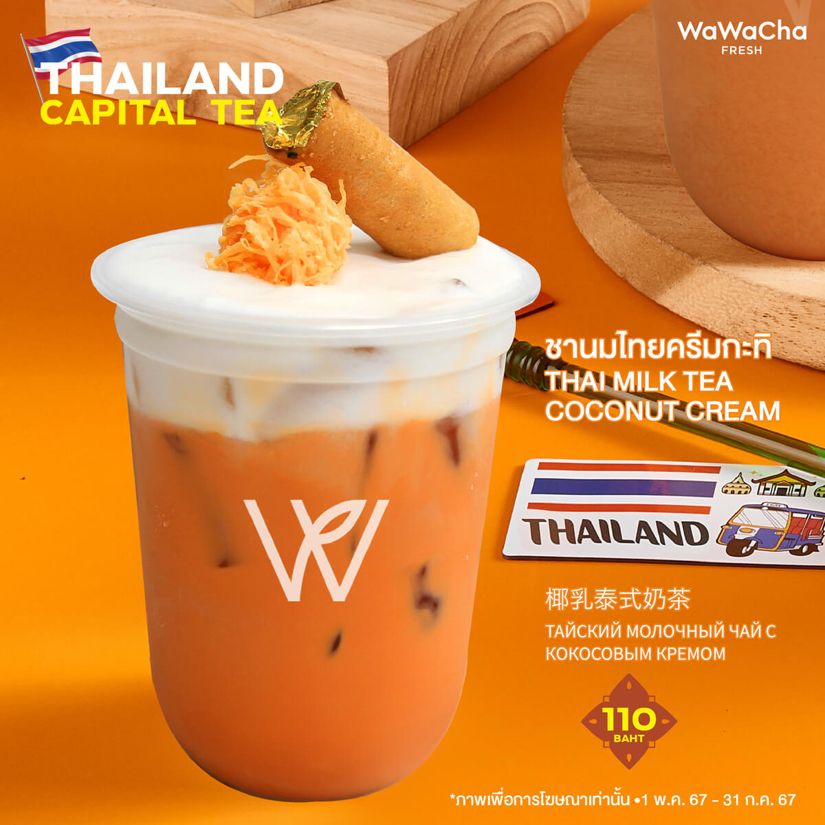 Wawa Cha ขอนำเสนอ “Thailand Capital Tea” การกลับมาอีกครั้งของชาไทย ที่มาพร้อมกับการคัดสรรวัตถุดิบที่พิถีพิถัน ทั้งครีมกะทิ มีรสชาติหวานมันของมะพร้าว เข้มข้นถึงใจสุดๆ ไร้สารเคมีเจือปน,ฝอยทองกรอบ รสหวานฉ่ำ กรอบนอกนุ่มใน, ทองม้วนกรอบ แป้งบางกรอบหอมอร่อย และทองคำเปลว Edible Gold ผสมผสานความเป็นไทย ได้ทันสมัยอย่างลงตัว
