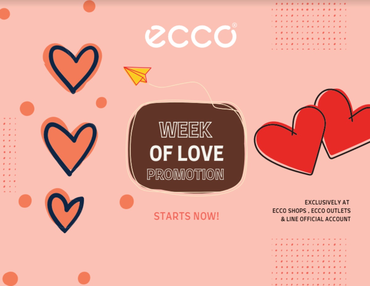 กับ WEEK OF LOVE Promotion เดือนแห่งความรัก ลดจัดหนัก จัดเต็ม — ECCO ลดราคารองเท้ารุ่นดังกว่า 100 กว่ารายการ ทั้งรองเท้าผู้ชาย รองเท้าผู้หญิง และ ECCO GOLF ลดราคาสูงสุด 50% ที่ ECCO Shop, ECCO Outlet และ LINE OA @eccoth