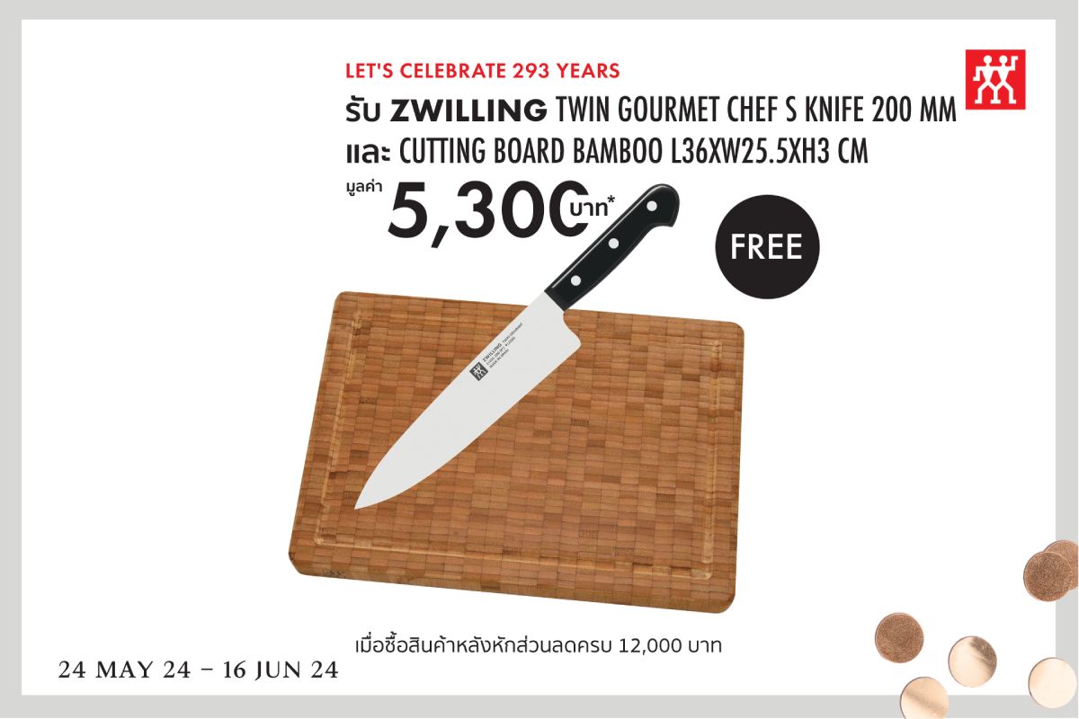 - ช้อปครบ 12,000 บาท (หลังหักส่วนลด) รับมีด รุ่น TWIN GOURMET CHEF S และเขียง รุ่น BAMBOO มูลค่ารวม 5,300 บาท
